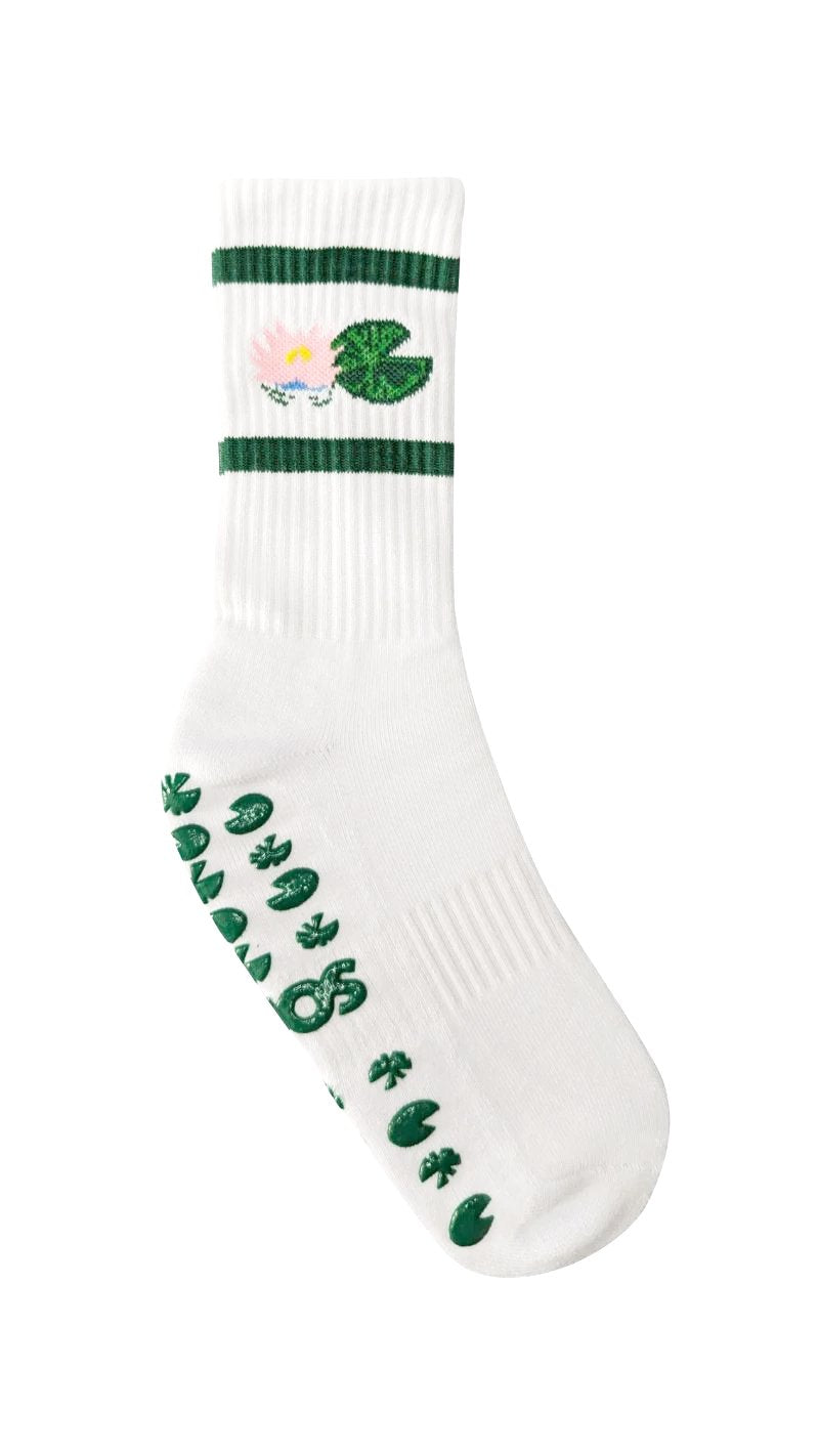 Bring a sense of calm and balance to your practice with the White Lilypad Crew Grip Socks. Featuring a crisp white design with lilypad-shaped grip patterns, these socks provide stability while adding a serene, nature-inspired touch to your routine. The breathable fabric keeps your feet cool, while the crew-length fit offers extra support and comfort. Perfect for yoga, pilates, and barre, these socks will help you stay grounded while you move with ease.