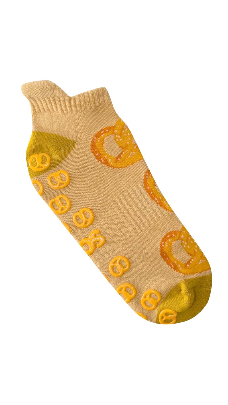 Strike a Pose with Flavor: Add a touch of whimsy and fun to your workout routine with these eye-catching pretzel grip socks. The playful pretzel sticky design and the unique brown color are sure to spark conversation at the studio.